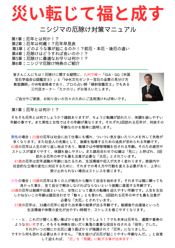 ニシジマでは毎年オリジナルの「厄除けマニュアル」をお配りしていますが、その中の「厄年早見表」をご覧頂くと分かります。